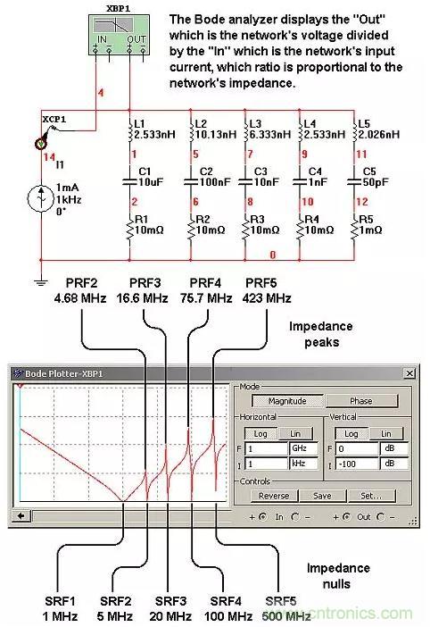 請記住,這五種電容每一個都不是單獨的電容器,而是一個串聯(lián)組合,包括電容器、電感器和電阻器??傊?,它們由串聯(lián)的RLC電路構(gòu)成,將在串聯(lián)諧振頻率(SRF)處表現(xiàn)出串聯(lián)諧振,其中SRF=1/(2 × π ×√ (L × C))。對于如上所述并聯(lián)連接的五個電容的組合,將會有五個串聯(lián)諧振頻率,并且還會有四個并聯(lián)諧振頻率,如圖1所示。