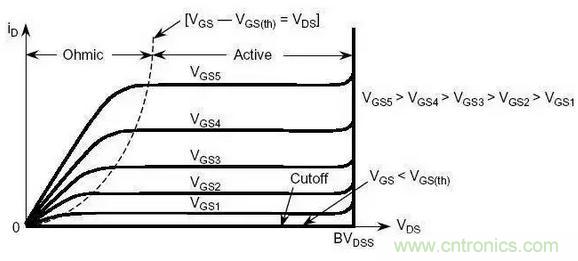該參數(shù)反映了器件可以處理的脈沖電流的高低,脈沖電流要遠(yuǎn)高于連續(xù)的直流電流。定義IDM的目的在于:線(xiàn)的歐姆區(qū)。對(duì)于一定的柵-源電壓,MOSFET導(dǎo)通后,存在最大的漏極電流。如圖所示,對(duì)于給定的一個(gè)柵-源電壓,如果工作點(diǎn)位于線(xiàn)性區(qū)域內(nèi),漏極電流的增大會(huì)提高漏-源電壓,由此增大導(dǎo)通損耗。長(zhǎng)時(shí)間工作在大功率之下,將導(dǎo)致器件失效。因此,在典型柵極驅(qū)動(dòng)電壓下,需要將額定IDM設(shè)定在區(qū)域之下。區(qū)域的分界點(diǎn)在Vgs和曲線(xiàn)相交點(diǎn)。