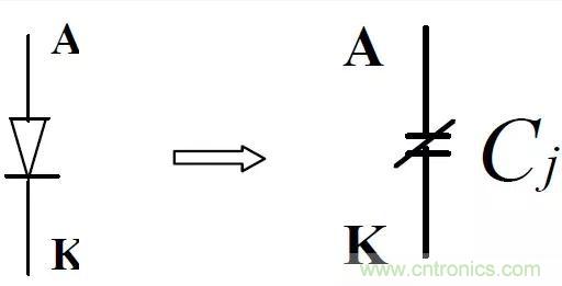 二極管反向截止時(shí)可用一電容等效,其容量與所加的反向電壓、環(huán)境溫度等有關(guān),大小可從制造商的手冊中獲得。
