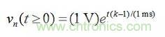 在圖5a的電路中,由vn表示的節(jié)點(diǎn)和地之間的阻抗為Z(s)=R||(1/sC)=R/(1+sRC),因此在s=-1/(RC)=-1/(1ms)時電路具有一個極點(diǎn)。假設(shè)vn(0)=1V,我們可以得到: