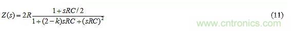 其中R2代表電位器在其左端和游標(biāo)之間的部分。對于給定的元件值,從左端到右端改變游標(biāo)將使k在0<k<2的范圍內(nèi)變化?,F(xiàn)在,R3上的電壓為(1+k)vn–vn,即kvn,在右邊是正的,表明R3將為C提供電流kvn/R3。鑒于R從C中汲取電流vn/R,因此從C流出的凈電流為iC=vn[1/R+1/(-R3/k)],表明C視R與一個負(fù)電阻–R3/k并聯(lián),凈等效電阻Req=R||(–R3/k)]。擴(kuò)展后可以得到: