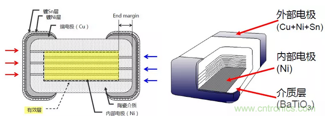 陶瓷電容主要由兩部分組成,陶瓷電容本體和外部電極組成。本體部分由內(nèi)部電極和介質(zhì)層組成,外部電極由銅鎳錫三層組成,柔性電容會(huì)在銅鎳之間多加一層Soft Term層,增加可靠性。