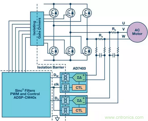 圖1所示為一個(gè)典型三相永磁電機(jī)驅(qū)動系統(tǒng),其利用檢測電阻測量繞組電流,并通過ADI公司的AD7403隔離式Σ-Δ調(diào)制器和sinc3