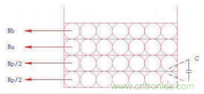 繞組電容就是指繞組之間產(chǎn)生的電容,比如說初級繞組Np與次級繞組Ns之間的電容。由于此電容存在于初次級繞組之間,對電路的EMI是非常不利的,因為初級產(chǎn)生的共模電流信號可以通過這個電容耦合到次級中去,這就造成了非常大的共模干擾,而共模干擾可能會引起電路噪音或者輸出不穩(wěn)定。