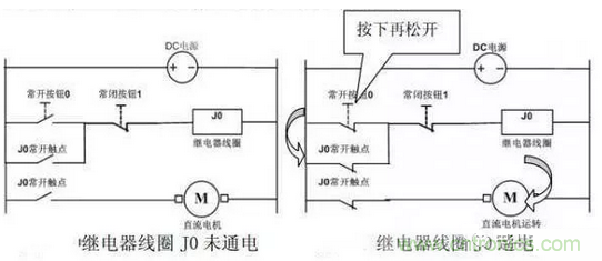 開機 = 按下常開按鈕0 → 繼電器線圈J0得電 → J0常開主觸點閉合 → 電機得電開機、同時J0常開輔助觸點自鎖 → 電機繼續(xù)運行,如圖2-8。