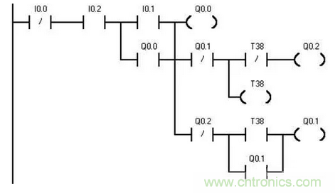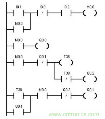 轉換后的梯形圖程序如圖2所示。按照梯形圖語言中的語法規(guī)定簡化和修改梯形圖。為了簡化電路,當多個線圈都受某一串并聯(lián)電路控制時,可在梯形圖中設置該電路控制的存儲器的位,如M0.0。簡化后的程序如圖3-所示。