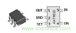 我們?nèi)砸訟AT4610為例,說明電子開關(guān)實(shí)現(xiàn)過流保護(hù)的工作原理。AAT4610采用SOT-23塑料封裝(如圖1),5個(gè)引腳的定義見表1。