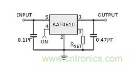 AAT4610的應(yīng)用電路十分簡單,只要外接兩只濾波電容和一只電阻器RSET,便可實(shí)現(xiàn)過流保護(hù)功能,如圖3。