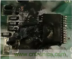 下圖就是由于反向電流通過元器件,導(dǎo)致電路板上的元器件燒毀。