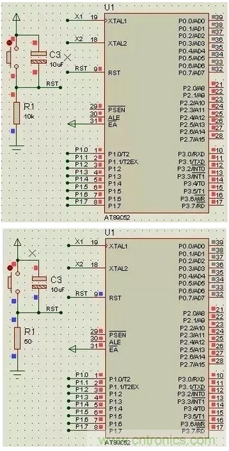 大家可以看到復(fù)位電路中電阻R1=10k時(shí)RST是高電平 ,而當(dāng)R1=50時(shí)RST為低電平,很明顯R1=10k時(shí)是錯(cuò)誤的,單片機(jī)一直處在復(fù)位狀態(tài)時(shí)根本無(wú)法工作。出現(xiàn)這樣的原因是由于RST引腳內(nèi)含三極管,即便在截止?fàn)顟B(tài)時(shí)也會(huì)有少量截止電流,當(dāng)R取的非常大時(shí),微弱的截止電流通過(guò)就產(chǎn)生了高電平。