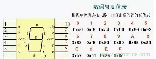 數(shù)碼管點(diǎn)亮形成的數(shù)字由a,b,c,d,e,f,e,dp(小數(shù)點(diǎn))構(gòu)成,字模及真值表如上圖。