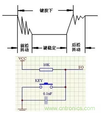 消除方法有兩種:軟件除抖和硬件除抖,其中硬件除抖是應(yīng)用了電容對(duì)高頻信號(hào)短路的原理。