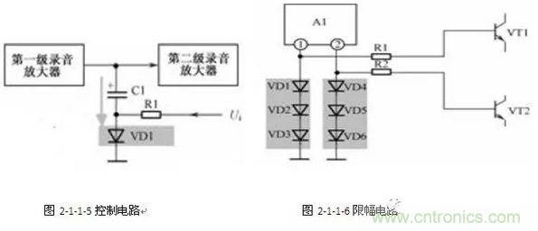 二極管導(dǎo)通之后,它的正向電阻大小隨電流大小變化而有微小改變,正向電流愈大,正向電阻愈?。环粗畡t大。利用二極管正向電流與正向電阻之間的特性,可以構(gòu)成一些自動控制電路。如圖9-43所示是一種由二極管構(gòu)成的自動控制電路,又稱ALC電路(自動電平控制電路),它在磁性錄音設(shè)備中(如卡座)的錄音電路中經(jīng)常應(yīng)用。圖2-1-1-5。