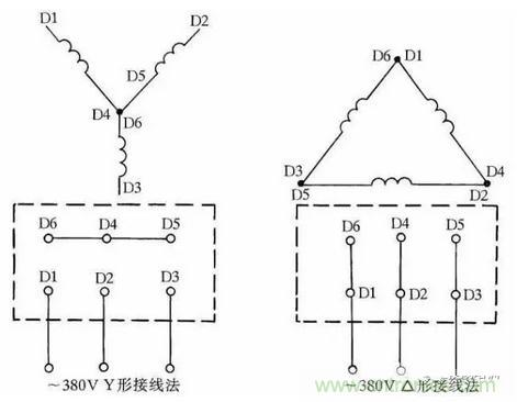 圖1:三相交流電動(dòng)機(jī)Y形和△形接線方法