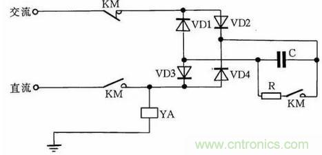 快速退磁的工作原理是:直流電磁鐵斷電后,交流電源通過橋式整流器和YA向電容C充電,隨著電容C兩端電壓的不斷升高,充電電流越來越小,而通過YA的電流又是交變的,從而使電磁鐵快速退磁。電容C的容量要根據(jù)電磁鐵的實(shí)際情況現(xiàn)場試驗(yàn)決定。R為放電電阻。