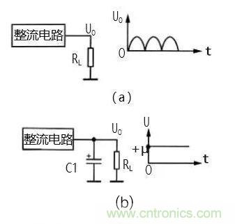 圖 2(a)為整流電路的輸出電路。交流電壓經(jīng)整流 電路之后輸出的是單向脈動(dòng)性直流電,即電路中的 UO。