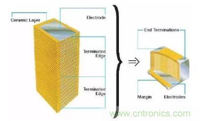 片式多層陶瓷電容器(MLCC),由內(nèi)電極、陶瓷層和端電極三部分組成,其介質(zhì)材料與內(nèi)電極以錯位的方式堆疊,然后經(jīng)過高溫?zé)Y(jié)燒制成形,再在芯片的兩端封上金屬層,得到了一個類似于獨石的結(jié)構(gòu)體,故MLCC也常被稱為“獨石電容器”。