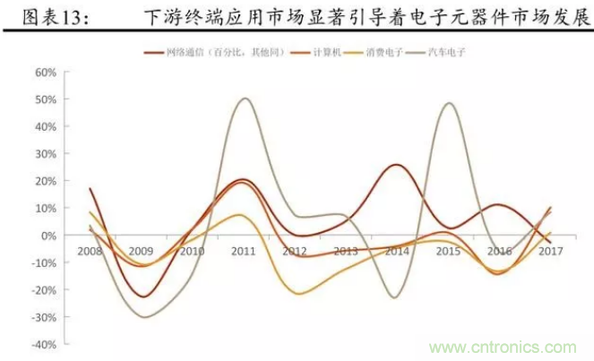 從被動元件的發(fā)展歷程來看,近些年來,產(chǎn)業(yè)鏈下游的需求擴大主導(dǎo)著被動元件市場的擴張。金融危機以來,全球電子元件市場規(guī)模的增長主要來自于網(wǎng)絡(luò)通信與汽車電子,尤其是智能手機。