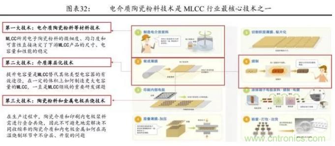 電介質(zhì)陶瓷粉料 的材料技術(shù)、介質(zhì)薄層化技術(shù)、陶瓷粉料和金屬電極的共燒技術(shù)被譽 為 MLCC 行業(yè)最核心的三大技術(shù)。