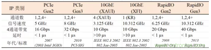 物聯(lián)網(wǎng)和5G聯(lián)網(wǎng)通信中除了信號(hào)收發(fā)單元(transceiver, TRX 以及TX/RX)設(shè)計(jì)芯片之外,離不開專用的系統(tǒng)芯片SoC,其中高性能與高速核心IP往往決定了SoC的性能和速度。常見的高性能與高速核心IP有: PCIe, 10 Gigabit Ethernet (10 GbE), RapidIO, SerDes, USB等。表1列出了幾種物聯(lián)網(wǎng)和5G時(shí)代常用的高性能與高速IP的信號(hào)速度和數(shù)據(jù)率。