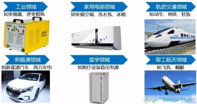 作為新型功率半導(dǎo)體器件的主流器件,IGBT已廣泛應(yīng)用于工業(yè)、 4C(通信、計算機(jī)、消費電子、汽車電子)、航空航天、國防軍工等傳統(tǒng)產(chǎn)業(yè)領(lǐng)域,以及軌道交通、新能源、智能電網(wǎng)、新能源汽車等戰(zhàn)略性新興產(chǎn)業(yè)領(lǐng)域。