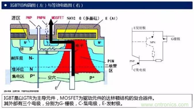 IGBT是以GTR為主導(dǎo)元件,MOSFET為驅(qū)動元件的達(dá)林頓結(jié)構(gòu)的復(fù)合器件。其外部有三個電極,分別為G-柵極,C-集電極,E-發(fā)射極。