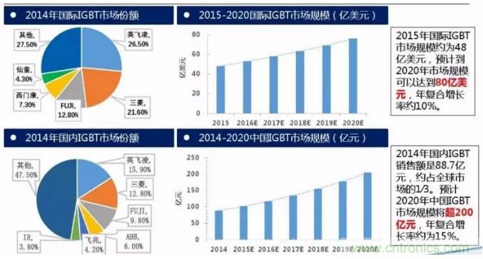 2015年國際IGBT市場規(guī)模約為48億美元,預(yù)計到2020年市場規(guī)??梢赃_(dá)到80億美元,年復(fù)合增長率約10%。2014年國內(nèi)IGBT銷售額是88.7億元,約占全球市場的1∕3。預(yù)計2020年中國IGBT市場規(guī)模將超200億元,年復(fù)合增長率約為15%。