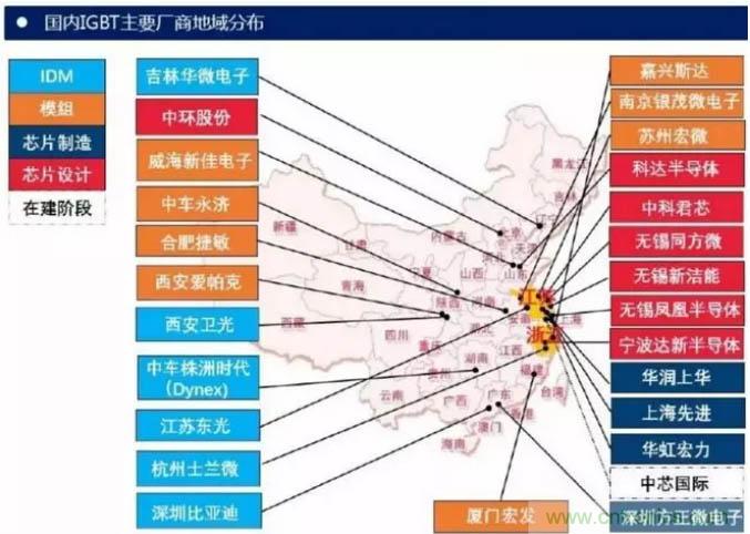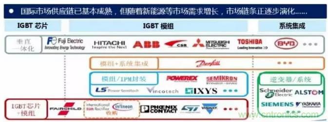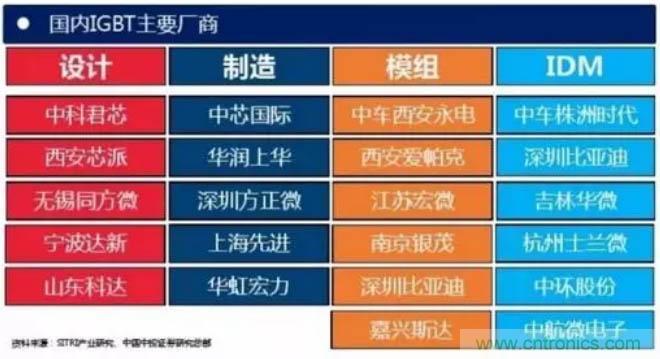 從公司來看,國外研發(fā)IGBT器件的公司主要有英飛凌、 ABB、三菱、西門康、東芝、富士等。中國功率半導(dǎo)體市場占世界市場的50%以上,但在中高端MOSFET及IGBT主流器件市場上,90%主要依賴進(jìn)口,基本被國外歐美、日本企業(yè)壟斷。