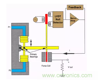 如果對(duì)這個(gè)組件施加加速度,就會(huì)對(duì)質(zhì)量施加一個(gè)力,它將試圖從零位置移動(dòng)。當(dāng)零檢測(cè)器檢測(cè)到運(yùn)動(dòng)時(shí),通過(guò)伺服放大器增加線圈電流以保持零位置。