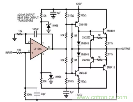 圖1:為了提升運算放大器的電壓輸出,一種方法是為Analog Devices的LT1055等基本器件加裝補(bǔ)償升壓晶體管,來利用運算放大器的輸入特性;這種設(shè)計可輸出±120V電壓。(圖片來源:Analog Devices)