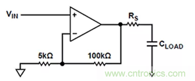 為解決這一問題,運算放大器設(shè)計人員提出了一種解決方案:在放大器輸出端與CLoad引腳之間加裝串聯(lián)電阻器,使器件能夠驅(qū)動大于1微法 (µF) 的負(fù)載(圖2)