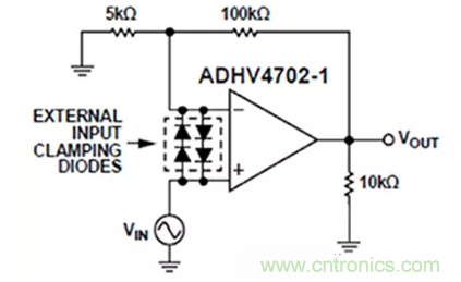 圖9:在ADHV4702-1輸入端接入外部二極管,可通過限制該器件的差分輸入電壓,保護(hù)其不受升壓電路大電流產(chǎn)生的熱效應(yīng)影響。(圖片來源:Analog Devices)