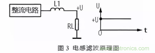 圖 3 所示是電感濾波原理圖。由于電感 L1 對(duì)直流電相當(dāng)于通路,這樣整流電路輸出的直流電壓直接加到負(fù)載 RL 上。