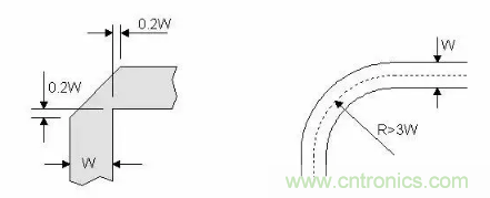 RF信號線如果走直角,拐角處的有效線寬會增大,阻抗不連續(xù),引起信號反射。為了減小不連續(xù)性,要對拐角進行處理,有兩種方法:切角和圓角。圓弧角的半徑應(yīng)足夠大,一般來說,要保證:R>3W。如圖右所示。