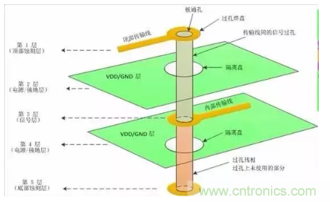 過孔是鍍在電路板頂層與底層之間的通孔外的金屬圓柱體。信號過孔連接不同層上的傳輸線。過孔殘樁是過孔上未使用的部分。過孔焊盤是圓環(huán)狀墊片,它們將過孔連接至頂部或內(nèi)部傳輸線。隔離盤是每個電源或接地層內(nèi)的環(huán)形空隙,以防止到電源和接地層的短路。