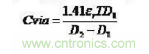 從等效電路模型可知,過孔本身存在對地的寄生電容,假設(shè)過孔反焊盤直徑為D2,過孔焊盤的直徑為D1,PCB板的厚度為T,板基材介電常數(shù)為ε,則過孔的寄生電容大小近似于: