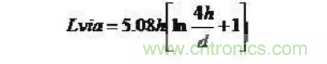 它的寄生串聯(lián)電感會削弱旁路電容的貢獻,從而減弱整個電源系統(tǒng)的濾波效用。假設(shè)L為過孔的電感,h為過孔的長度,d為中心鉆孔的直徑。過孔近似的寄生電感大小近似于: