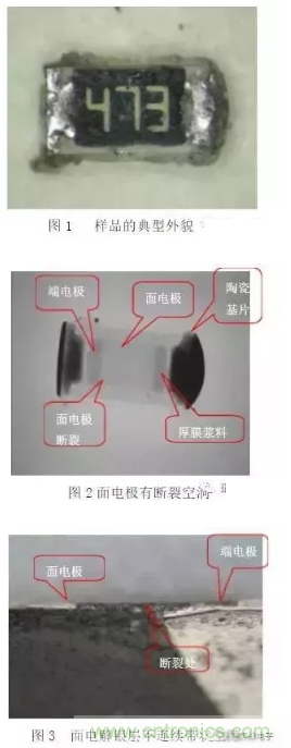 1) 開路:主要失效機(jī)理為電阻膜燒毀或大面積脫落,基體斷裂,引線帽與電阻體脫落。
