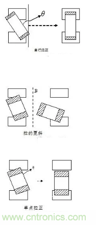 當(dāng)貼片時(shí),由于焊墊的不平或焊膏的滑動(dòng),造成片感偏移了θ角。由于焊墊熔融時(shí)產(chǎn)生的潤濕力,可能形成以上三種情況,其中自行歸正為主,但有時(shí)會(huì)出現(xiàn)拉的更斜,或者單點(diǎn)拉正的情況,片感被拉到一個(gè)焊盤上,甚至被拉起來,斜立或直立(立碑現(xiàn)象)。目前帶θ角偏移視覺檢測的貼片機(jī)可減少此類失效的發(fā)生。
