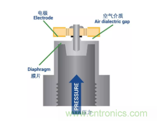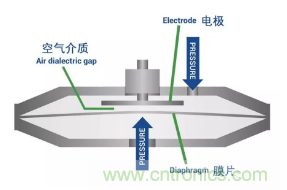 簡(jiǎn)單地說(shuō),這些壓力傳感器是一種電容器,一種具有充電能力的裝置。當(dāng)壓力作用到傳感器內(nèi)部的膜片上時(shí),膜片就會(huì)收縮,或向固定電極彎曲,并改變電容。這種物理變化會(huì)導(dǎo)致電子輸出的變化,該裝置可將壓力讀數(shù)轉(zhuǎn)換成電流或電壓值。