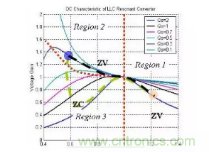 黑虛線代表負(fù)載變化期間的理想路徑,而綠虛線表示實際路徑。在負(fù)載從低變高的過程中,可以看到系統(tǒng)經(jīng)過ZCS區(qū)域,因此,寄生體二極管的性能變得非常重要。出于這個原因,新LLC設(shè)計的趨勢是使用體二極管恢復(fù)時間非常短的功率器件。
