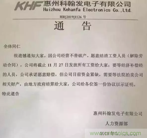 不僅僅是韓國LG因銷量下滑關(guān)閉PCB業(yè)務(wù),就在前幾日,PCB廠商惠州科翰發(fā)電子發(fā)出破產(chǎn)公告。公告稱,由于公司經(jīng)營不善導(dǎo)致破產(chǎn),和員工解除勞動合同并結(jié)清工資,將于11月27日發(fā)放薪資給大家,通告中特別說明公司愿意賠償給需要經(jīng)濟(jì)補(bǔ)償金的人員,只是由于公司資金緊缺,公司會和員工簽一份證明協(xié)議,待法院拍賣公司財產(chǎn)后由地方政府結(jié)算,也算是給員工一個交代。