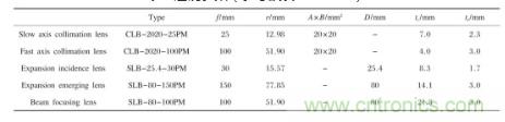 仿真時使用SIGMA KOKI公司生產(chǎn)的透鏡,表2列出了透鏡的參數(shù),其中f為焦距,r為曲率半徑,A×B為柱面透鏡長×寬,D為球面透鏡直徑,te為透鏡邊緣厚度,tc為透鏡中心厚度。