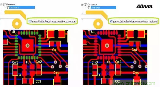 如果整個(gè)PCB的最小安全間距設(shè)置是8mil,那么元器件焊盤的間距明顯違反了規(guī)則設(shè)置。在規(guī)則檢查時(shí)或在線編輯時(shí)會一直綠色高亮來顯示違規(guī)。這種違規(guī)顯然是不需要處理的,我們應(yīng)該修正規(guī)則設(shè)置來消除綠色高亮顯示。在原來的處理辦法中,是用query語言單獨(dú)為這個(gè)器件定義不同的安全間距規(guī)則,并設(shè)置為高優(yōu)先級。在新的版本中,只需要簡單的勾選選項(xiàng)即可解決這個(gè)問題,即忽略封裝內(nèi)的焊盤間距Ignore Pad to Pad clearance within a footprint。如下圖所示。