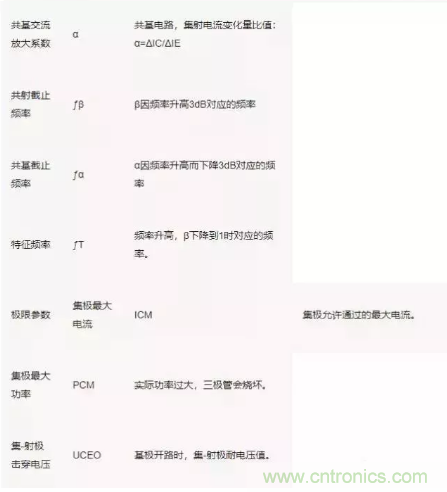 三極管性能參數(shù)較多,有直流、交流和極限參數(shù)之分: