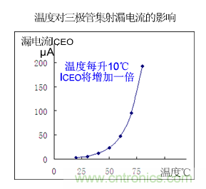 ICEO是由少數(shù)載流子漂移運動形成的,它與環(huán)境溫度關(guān)系很大,ICEO隨溫度上升會急劇增加。溫度上升10℃,ICEO將增加一倍。