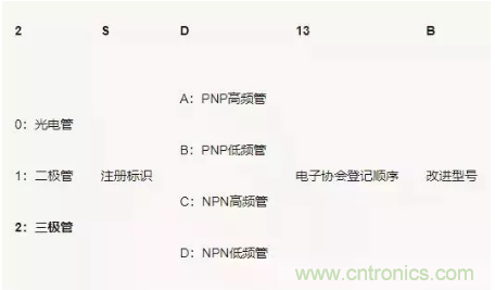 不同的國家/地區(qū)對三極管型號命名方式不同。還有很多廠家使用自己的命名方式。