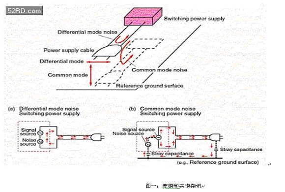由EMI產(chǎn)生的雜訊也分成兩類:差模雜訊和共模雜訊。簡言之,差模雜訊是當兩條電源供應(yīng)線路的電流方向互為相反時發(fā)生的,如圖1(a)所示。而共模雜訊是當所有的電源供應(yīng)線路的電流方向相同時發(fā)生的,如圖1(b)所示。一般而言,差模訊號通常是我們所要的,因為它能承載有用的資料或訊號;而共模訊號(雜訊)是我們不要的副作用或是差模電路的“副產(chǎn)品”,它正是EMC的最大難題。從圖一中,可以清楚發(fā)現(xiàn),共模雜訊的發(fā)生大多數(shù)是因為“雜散電容(stray capacitor)”的不當接地所造成的。這也是為何共模也稱作“接地泄漏模式”的原因。
