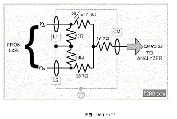 有一種裝置稱作“LISN MATE”,不過,目前已經(jīng)很少被使用了。它會衰減DM雜訊約50dB,但不會大幅衰減CM雜訊(約僅衰減4dB)。它的電路如圖五所示。