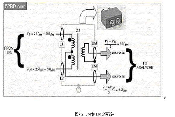 圖六是一種以變壓器為基礎(chǔ)的裝置,它是利用共模電壓無法使變壓器工作的原理;因為本質(zhì)上需要差動的一次測電壓,才能使變壓器線圈內(nèi)的磁通量“擺動(swing)”。它不像LISN MATE,此時CM和DM雜訊是一起輸出。不過,上述的兩種方法都需要修改LISN電路。因為一般的LISN只提供VL或VN,無法同時提供這兩者。最好是購買CM和DM雜訊有分離輸出的LISN。此外,也應(yīng)該要有總和檢視的功能,以確定是否有遵守技術(shù)規(guī)范的限制。
